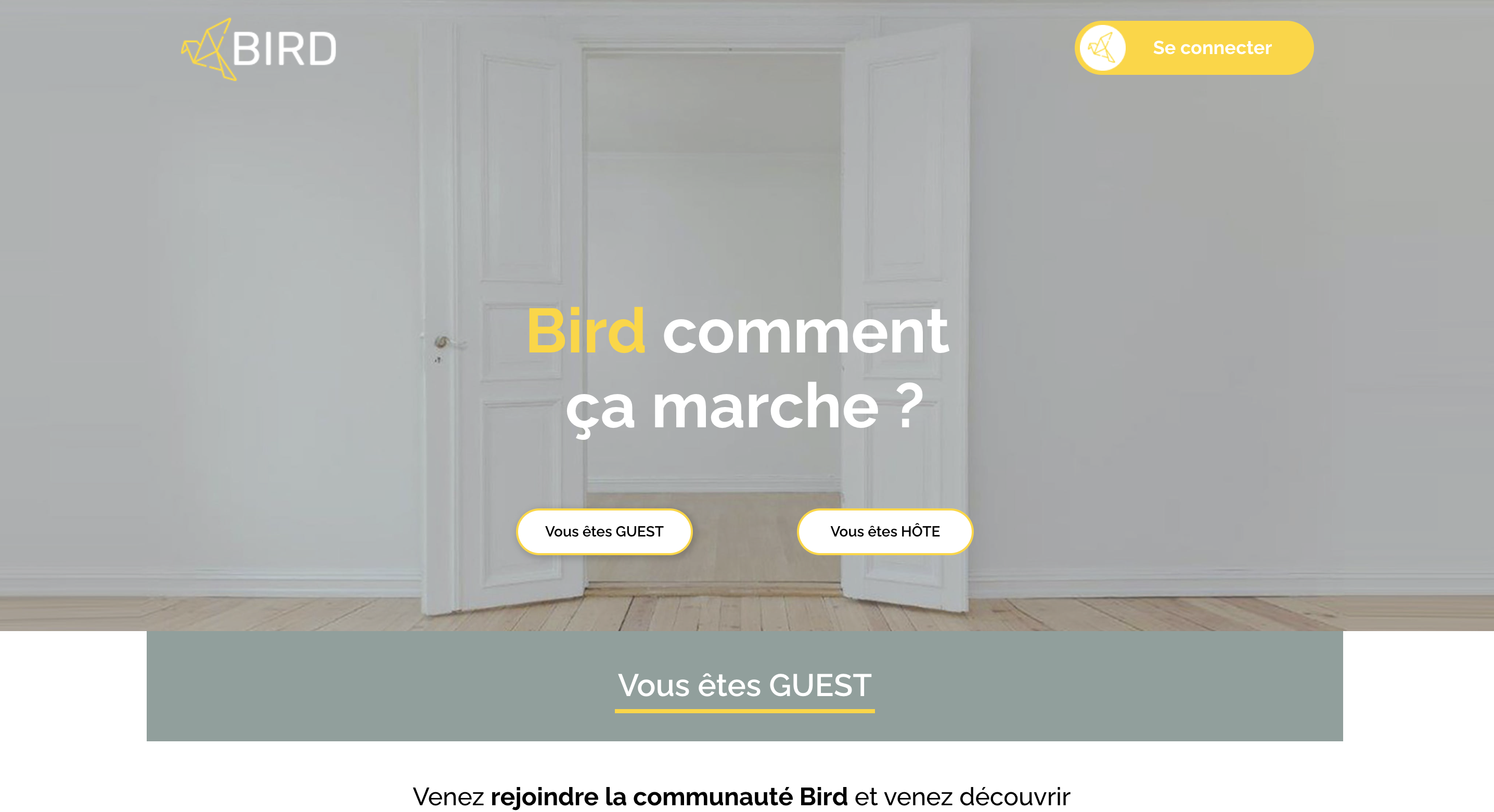 Bird is a platform dedicated to the vacation rental community. These rentals are associated with good public or private plans (restaurant, outing, museum, unusual places). It allows everyone to experience unique and unforgettable stays. Each Bird "Hôte" or "Guest" member can promote personalized deals and make them live in a unique way.